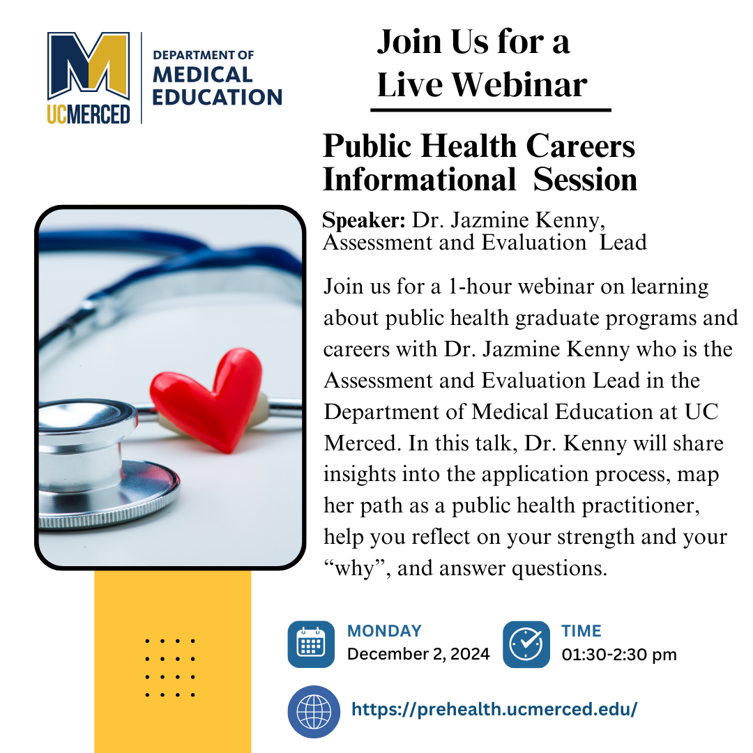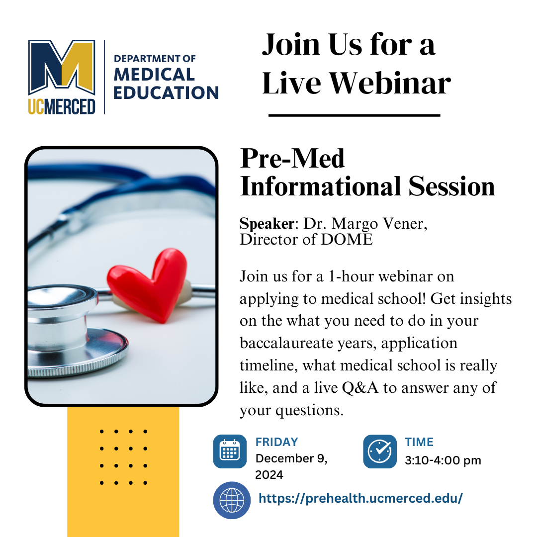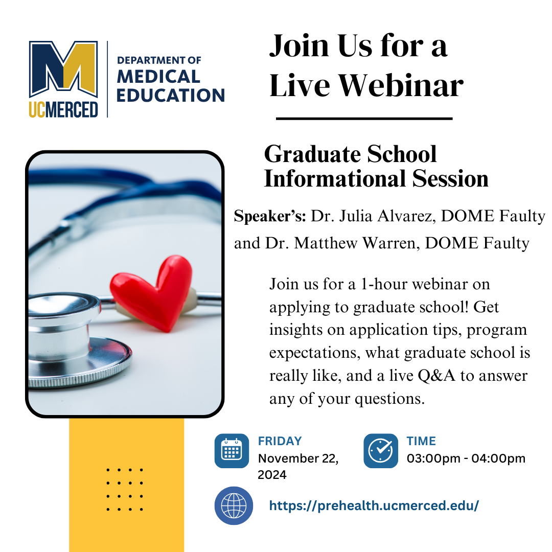 We look forward to seeing you there and supporting you as you explore the many exciting opportunities in the pre-health field! For additional questions please contact: meded at ucmerced.edu<mailto:meded at ucmerced.edu>