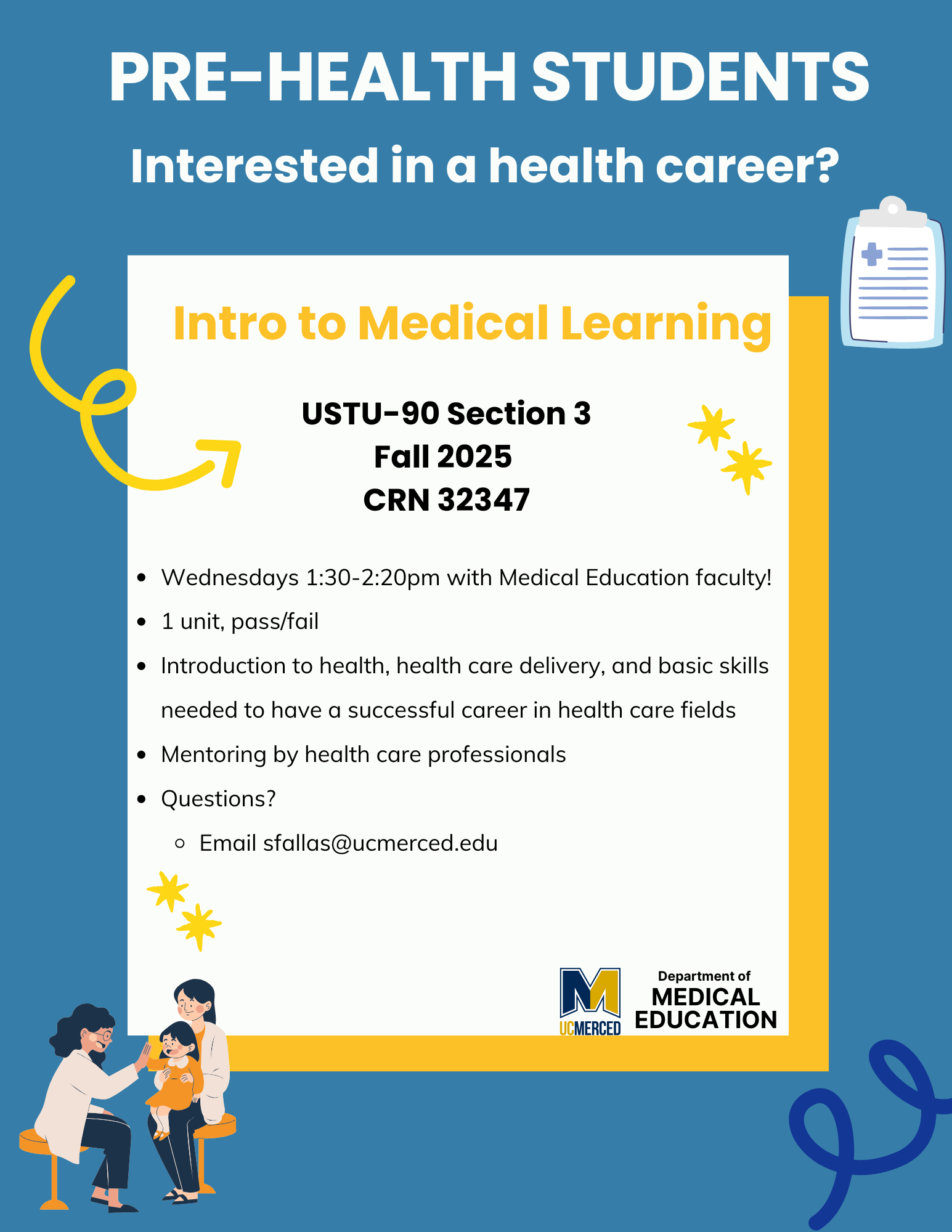 The Dept. of Medical Education offers a 1-unit course on an Introduction to Medical Education, which encompasses an introduction to health, health care delivery, and basic skills needed to have a successful career in health care fields. This course also offers group mentoring with central valley clinicians, an amazing opportunity to find mentorship and get further insight into the realities of health care careers.