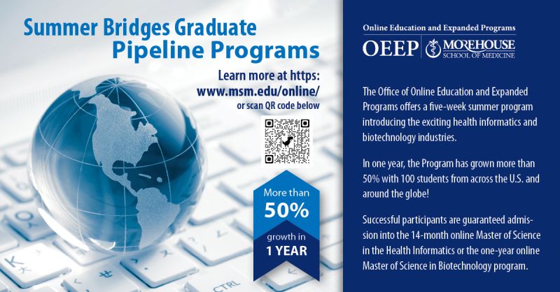 The Office of Online Education and Expanded Programs<https://www.msm.edu/online/> offers a 5-week summer program that is built to expose motivated undergraduate juniors and seniors and post baccalaureates to the field of health informatics, biotechnology, medical cannabis therapeutics, and Justice-Involved Care. We offer three tracks: Bridges to Biotechnology and Bioentrepreneurship, Bridge to Health Informatics, and Bridge to Medical Cannabis Therapeutics with virtual learning formats and synchronous meetings. Participants who successfully complete this 5-week summer program are eligible to apply for the 14-month online Master of Science in Health Informatics (MSHI<https://www.msm.edu/online/masterofscienceinhealthinformatics/index.php>), the 1-year online Master of Science in Biotechnology (MSBT),<https://www.msm.edu/online/biotechnology/index.php> and the 1-year online Master of Science in Biotechnology with a concentration in Medical Cannabis Therapeutics (MSBT-MCT) program<https://www.msm.edu/online/biotechnology/msbtcannabis/index.php> .