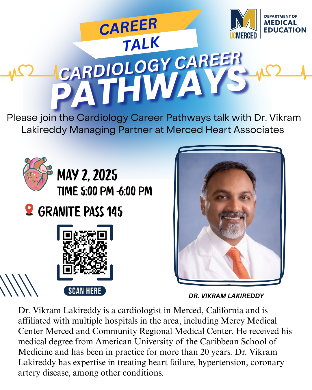Join us for an exclusive Cardiology Career Pathways Talk featuring Dr. Vikram Lakireddy, Managing Partner at Merced Heart Associates. This is a unique opportunity to hear directly from a leading expert in the field about his journey, insights, and advice for aspiring healthcare professionals.