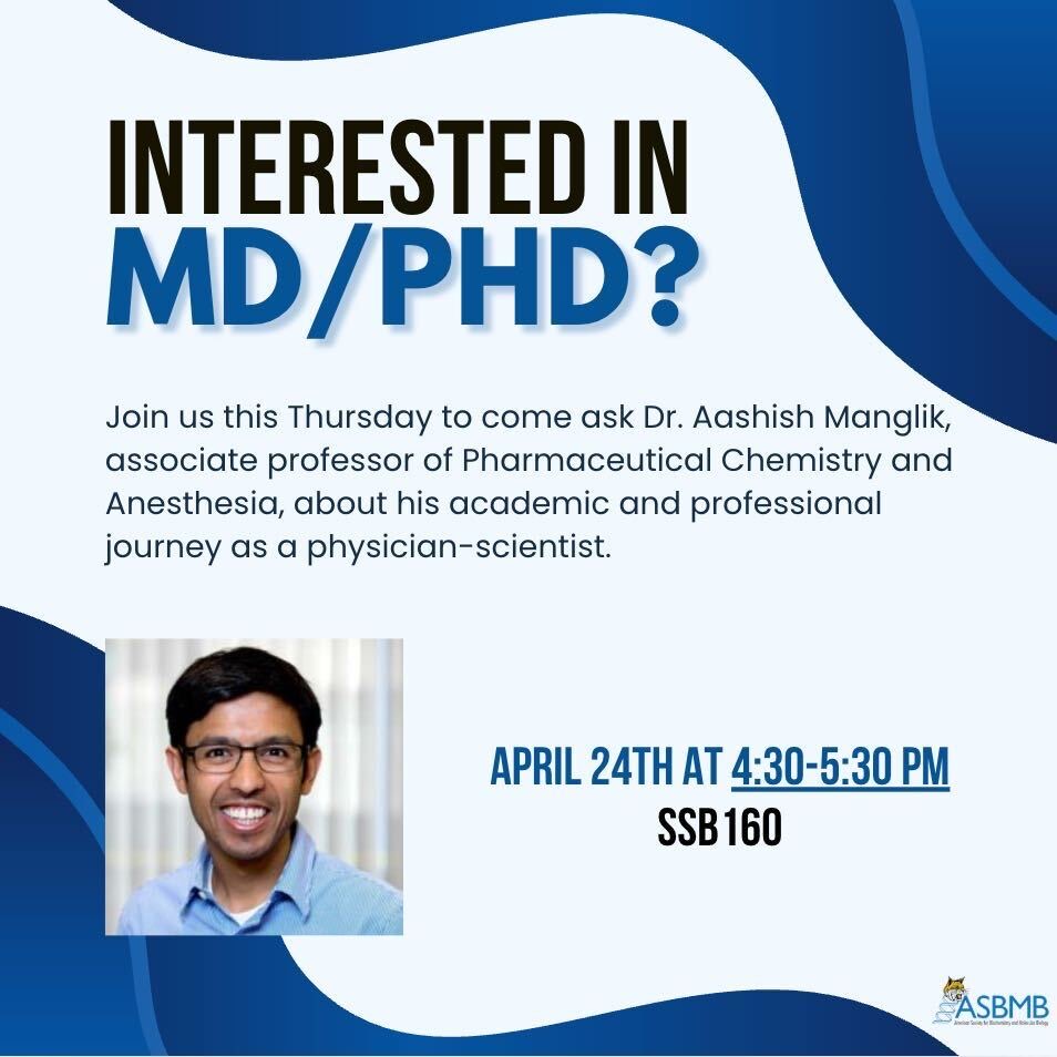 Are you considering a career as a physician-scientist? Join us this Thursday for an insightful session with Dr. Aashish Manglik, Associate Professor of Pharmaceutical Chemistry and Anesthesia at UCSF<https://profiles.ucsf.edu/aashish.manglik>. Dr. Manglik will share his academic and professional journey, offering valuable perspectives on the MD/PhD path<https://students-residents.aamc.org/md-phd-dual-degree-training/md-phd-dual-degree-training>.