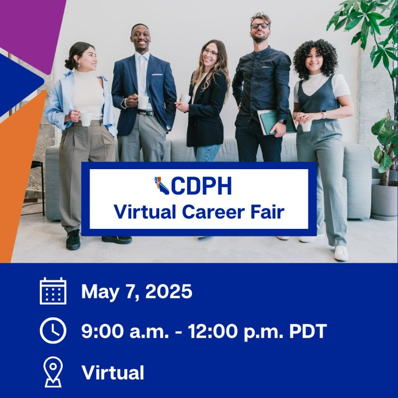 Join us virtually on Wednesday, May 7th, from 9:00am to 12:00pm for the 2025 California Department of Public Health (CDPH) Virtual Career Fair!