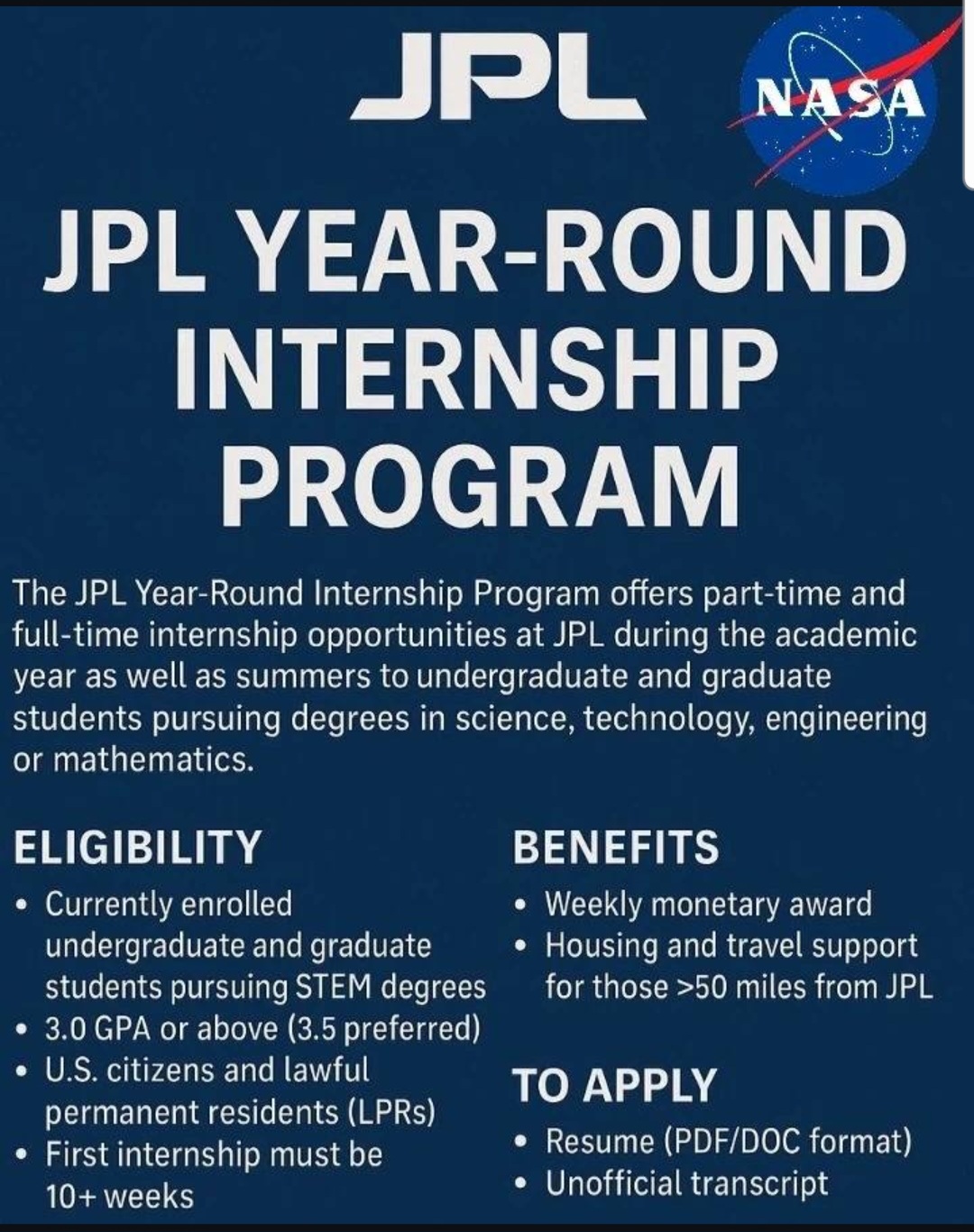 The JPL Year-Round Internship Program<https://www.jpl.nasa.gov/edu/internships/apply/jpl-year-round-internship-program/> offers part-time and full-time internship opportunities at JPL during the academic year as well as summers to undergraduate and graduate students pursuing degrees in science, technology, engineering or mathematics.