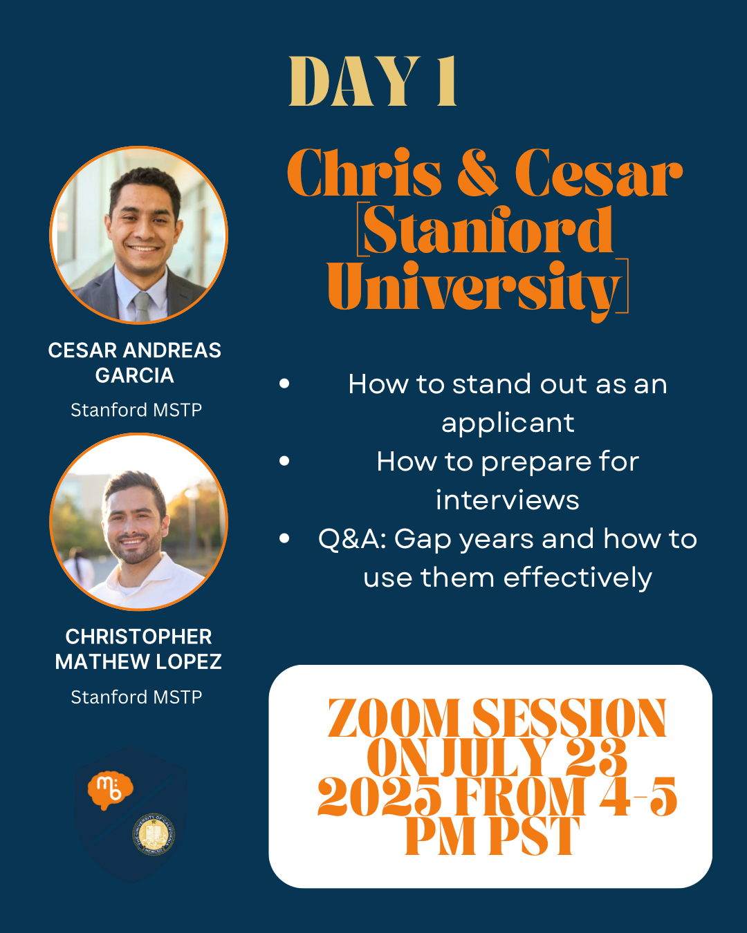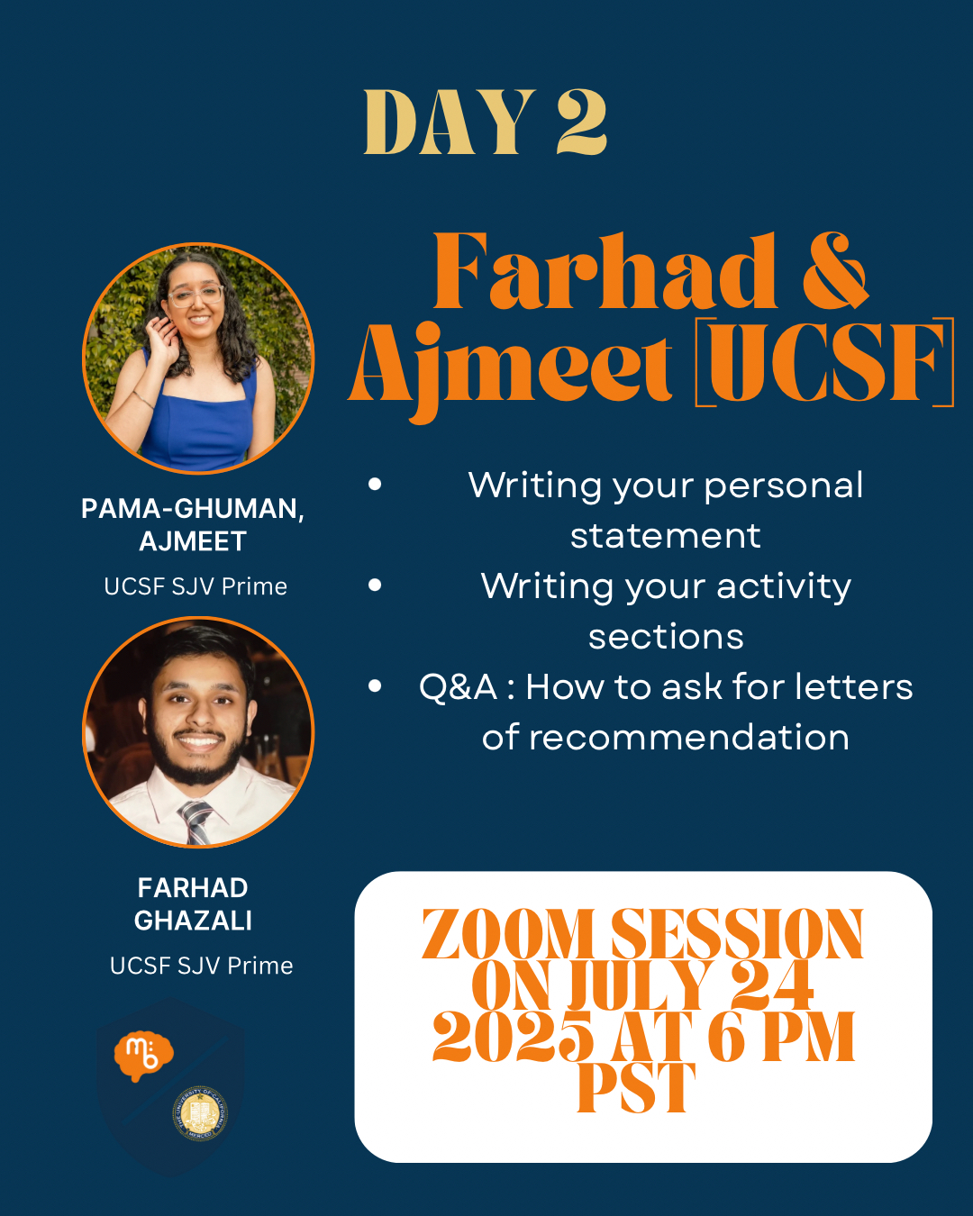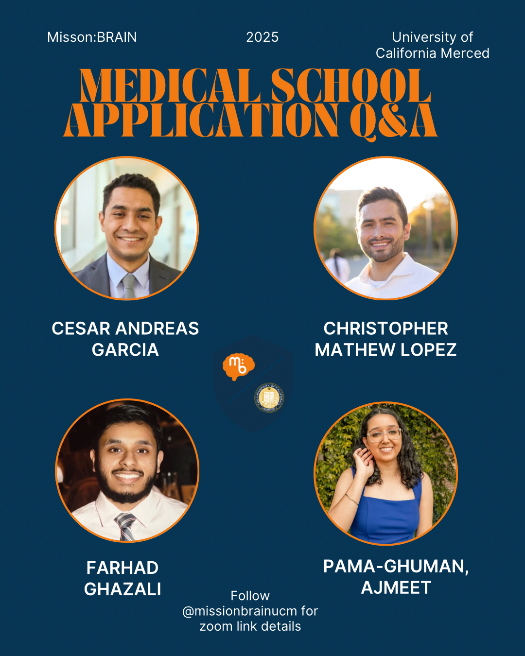 "Hello everyone, I wanted to share an event that I've been planning for our Mission:BRAIN UC Merced Chapter! Join us July 23rd at 4PM & July 24th at 6PM, for a 2-Day Medical School Application Virtual Series, featuring medical students from Stanford University & UCSF. Reach out to @Yovanny Solorio Espitia<mailto:ysolorioespitia at ucmerced.edu> with any questions."