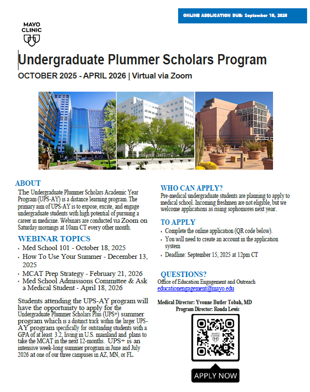 Undergraduate Plummer Scholars (UPS) Program<https://college.mayo.edu/academics/office-of-education-engagement-and-outreach/programs/undergraduate-plummer-scholars-ups-program/>