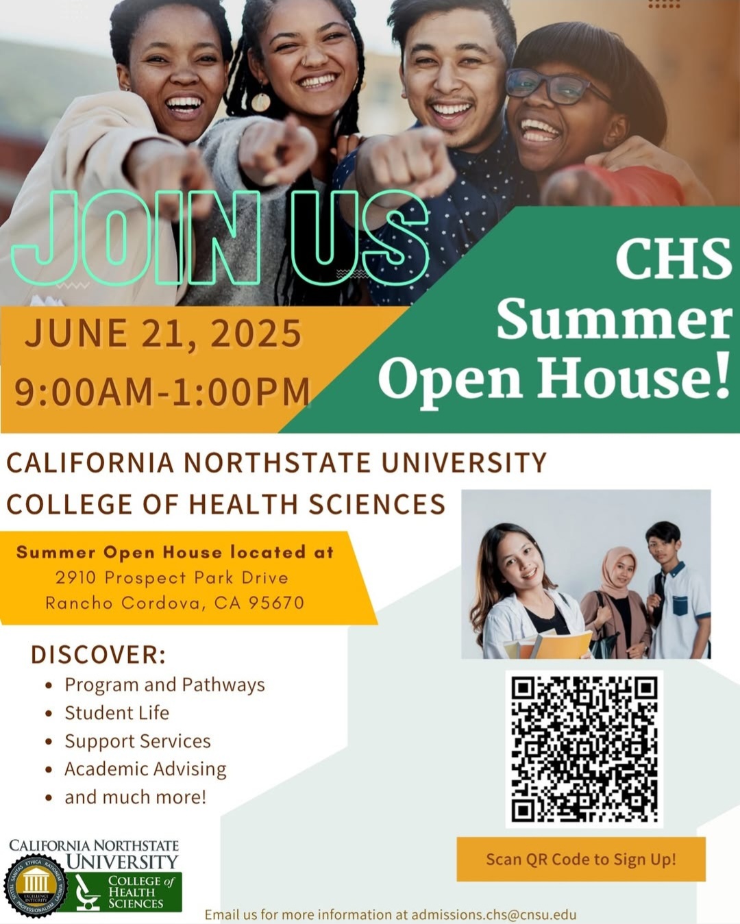 Join California Northstate University<https://www.cnsu.edu/> for the College of Health Sciences<https://healthsciences.cnsu.edu/> Open House and discover all that our programs have to offer! Explore our state-of-the-art facilities designed to support hands-on learning and innovative research in health and wellness. You'll have the opportunity to meet our dedicated faculty and connect with representatives from professional schools to learn more about career pathways in nursing, medicine, pharmacy, and dentistry. Take a guided campus tour led by our knowledgeable student ambassadors and gain personalized information about our Bachelor of Science in Nursing (BSN) program<https://healthsciences.cnsu.edu/bsn/>, as well as our pre-medical, pre-pharmacy, and pre-dental tracks. Whether you're just starting to explore your options or ready to take the next step, this is the perfect opportunity to see how we can support your goals in the healthcare!