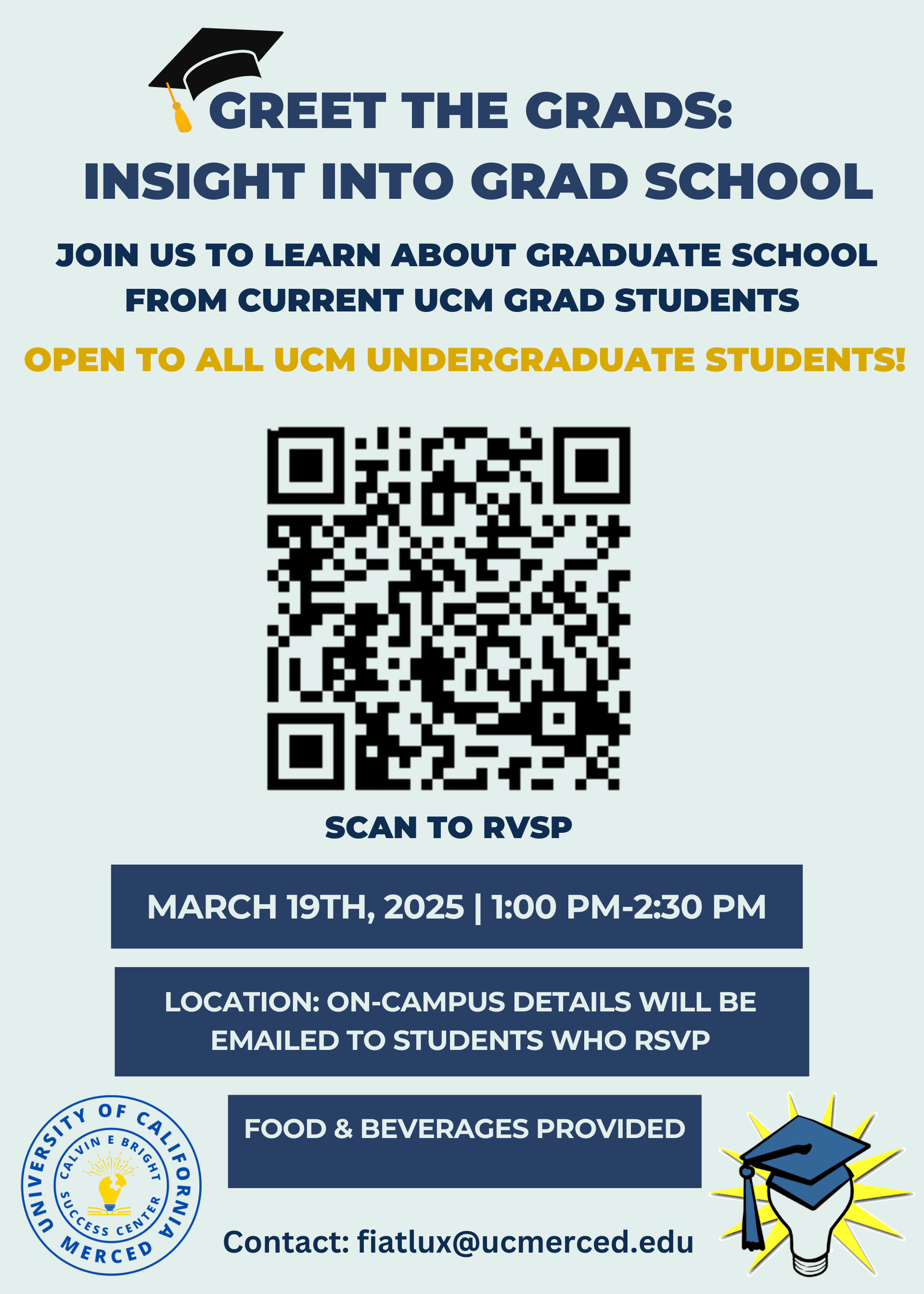 In collaboration with the Calvin E. Bright Success Center,<https://learning.ucmerced.edu/> the Fiat Lux Scholars Program<https://fiatlux.ucmerced.edu/> will be hosting a "Greet the Grads: Insight Into Grad School" event on Wednesday, March 19th from 1:00 pm-2:30 pm in the UC Merced Conference Center Grand Ballroom.