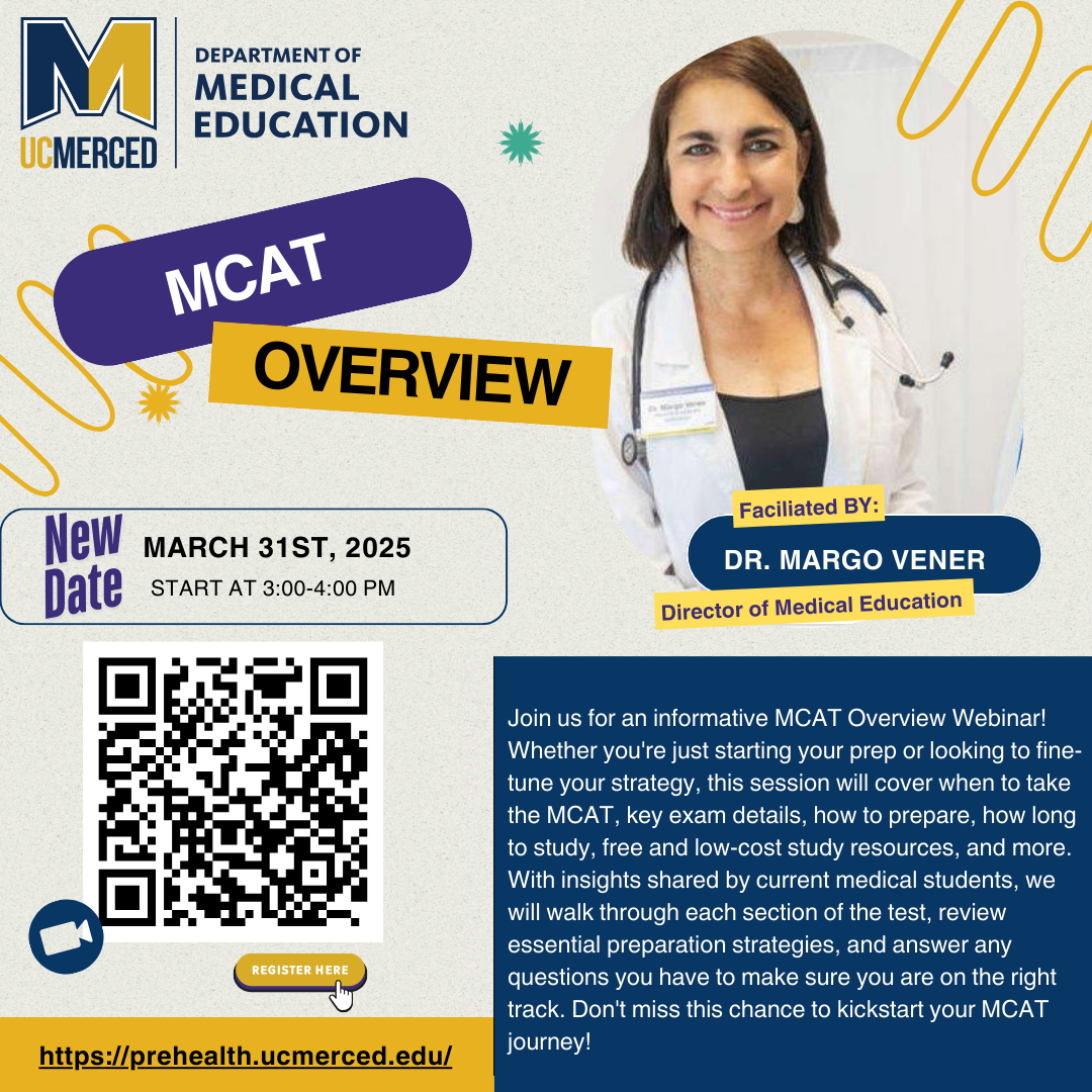 Description: Join us for an informative MCAT Overview Webinar! Whether you're just starting your prep or looking to fine-tune your strategy, this session will cover when to take the MCAT, key exam details, how to prepare, how long to study, free and low-cost study resources, and more. With insights shared by current medical students, we will walk through each section of the test, review essential preparation strategies, and answer any questions you have to make sure you are on the right track. Don't miss this chance to kickstart your MCAT journey!