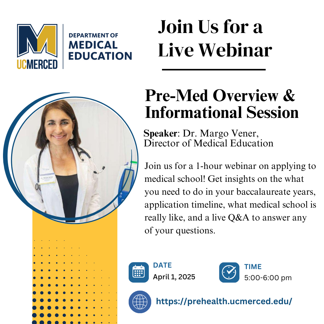 A calendar invite will be sent to you with the zoom details and an email reminder will be sent before the session. Feel free to reach out to meded at ucmerced.edu with any questions.