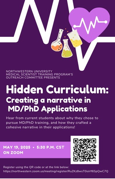 Join the Northwestern MSTP on May 19th at 5:30pm CT (CHECK TIME ZOME) to hear from current MSTP students about why they chose to pursue an MD/PhD and how they crafted a cohesive narrative in their applications, incorporating different interests, accomplishments, and activities! Register here!<https://northwestern.zoom.us/meeting/register/RuZKz8wsT0iaVf6SpQwC7Q>