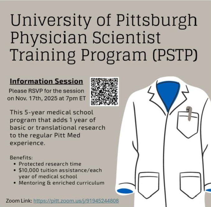 If you're a pre-med student interested in research, come learn about the University of Pittsburgh’s Physician Scientist Training Program (PSTP)<https://www.pstp.pitt.edu/>! The PSTP<https://www.pstp.pitt.edu/> is a 5-year medical school program that adds a year of basic or translational research to the regular Pitt Med<https://www.medschool.pitt.edu/> experience. The University of Pittsburgh School of Medicine<https://www.medschool.pitt.edu/> is a research powerhouse with great clinical training and welcomes applications from students residing outside of Pennsylvania.