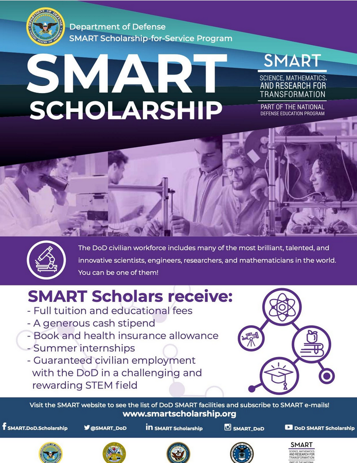 Science, Mathematics, and Research for Transformation (SMART) is a DoD Scholarship Program for STEM Students