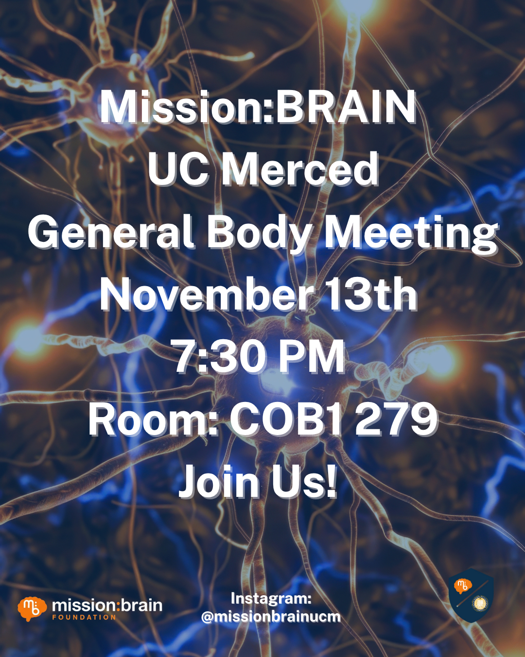 Hey everyone! I’d like to welcome you all to our Mission:BRAIN<https://www.missionbrain.org/> general body meeting happening this Thursday, Nov 13th @ 7:30pm! The room is COB1 279, hope to see all of you there! There will be snacks, drinks & smiles! Open to all majors!”