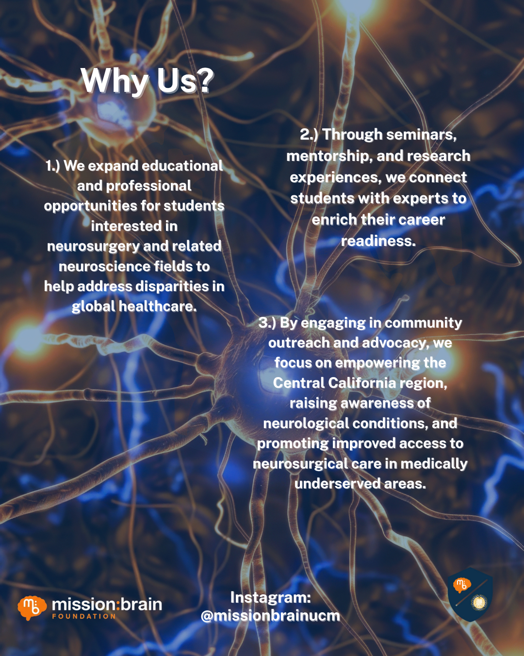 Mission:BRAIN<https://www.missionbrain.org/> at the University of California, Merced is dedicated to expanding educational and professional opportunities for students interested in neurosurgery, neurology, and neuroscience research. Our chapter is strongly committed to addressing global healthcare disparities. Through seminars, mentorship, research experiences, we connect students with medical professionals to enrich their education and career readiness. By engaging in community outreach and advocacy, we focus on empowering the Central California region, raising awareness of neurological conditions, and promoting improved access to neurosurgical care in medically underserved areas.