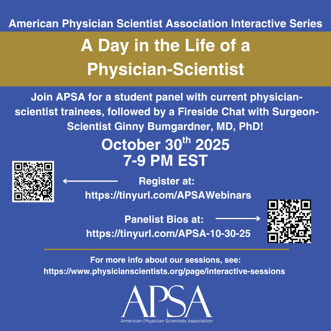 What does it really mean to be a physician-scientist? Wondering what the path looks like—and how you might become one too? APSA invites you to A Day in the Life of a Physician-Scientist on October 30th from 7–9 PM EST. The event will feature a student panel of MD/PhD trainees followed by a Fireside Chat with Ginny Bumgardner, MD, PhD, a surgeon-scientist who integrates clinical care and discovery. Join us to explore the career path, hear personal insights, and learn what it takes to bridge science and medicine!
