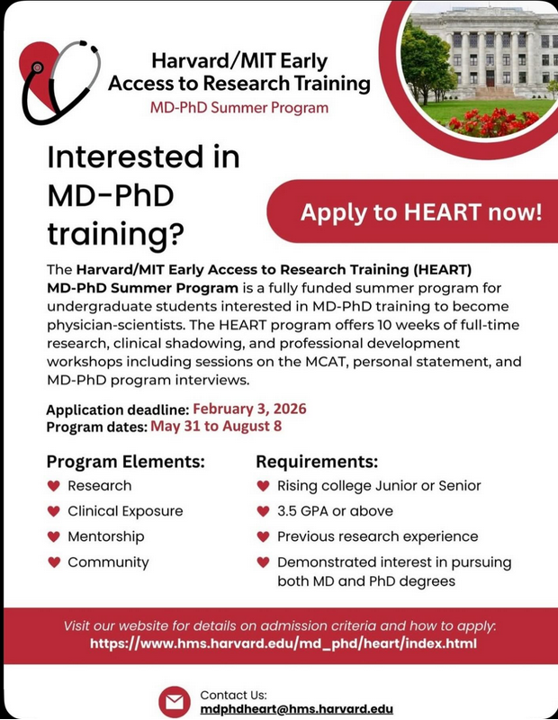 The Harvard/MIT Early Access to Research Training (HEART) MD-PhD Summer<https://www.hms.harvard.edu/md_phd/heart/index.html> Program was founded in 2022 by Harvard/MIT MD-PhD students to expand access to physician-scientist training in preparation for MD-PhD applications and careers. HEART<https://www.hms.harvard.edu/md_phd/heart/index.html> is a fully funded summer experience and a track of the Summer Honors Undergraduate Research Program. The program welcomes applications from all undergraduates with a strong interest in the physician-scientist path.