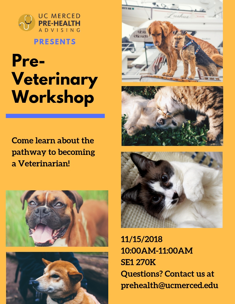 Are you interested in learning more about the pathway to becoming a veterinarian? Feel free to stop by our Pre-Veterinary Workshop Tomorrow November 15th from 10:00AM to 11:00AM in SE1 270K! Feel free to contact us with questions at prehealth at ucmerced.edu.