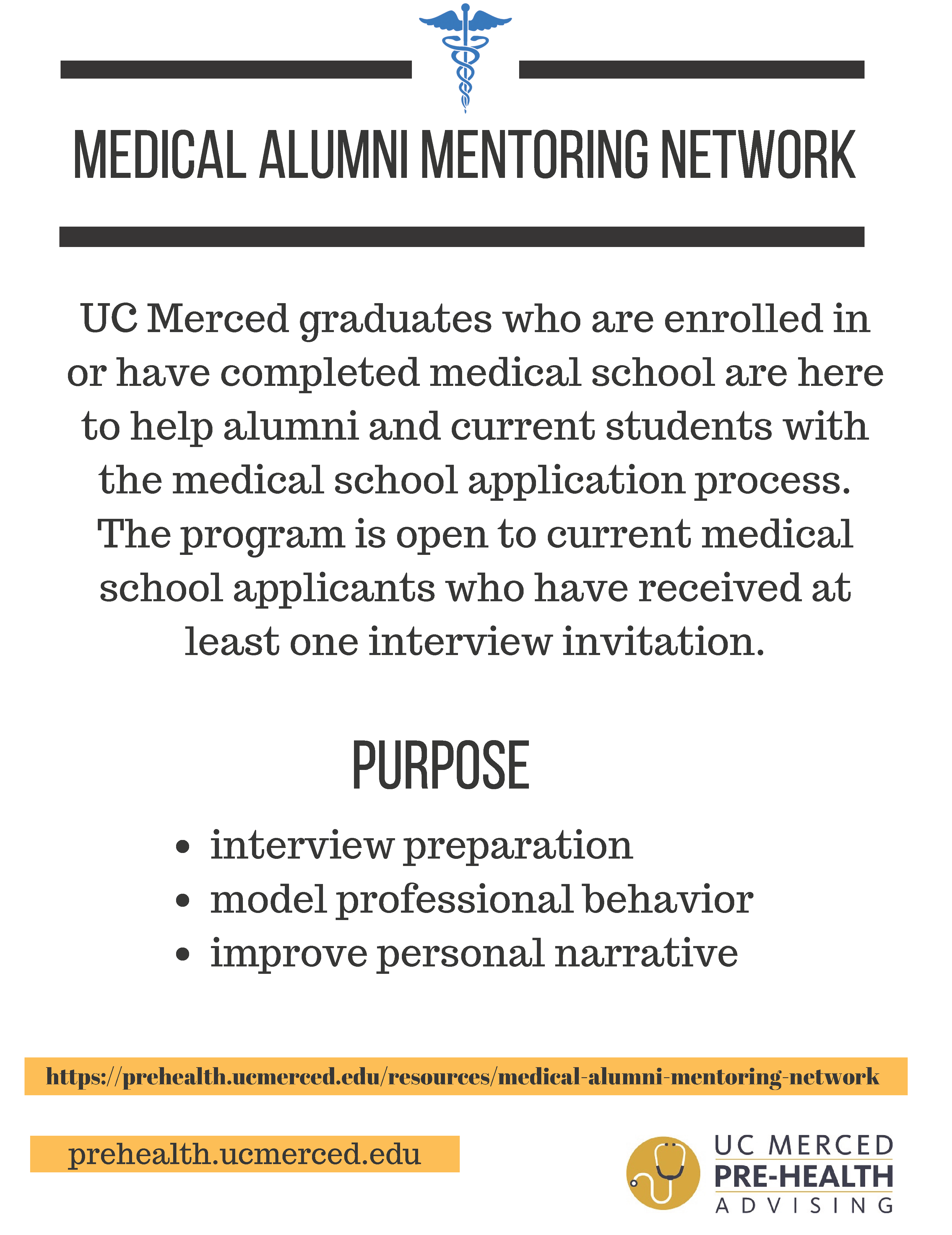 UC Merced graduates who are completing or have completed medical school are hoping to help current applicants with the medical school application process, with specific focus on interview preparation. This is a great opportunity for alumni and current students who are applying to medical school and have received at least one interview invitation. More information on the program and how to register can be found here<https://prehealth.ucmerced.edu/resources/medical-alumni-mentoring-network>.