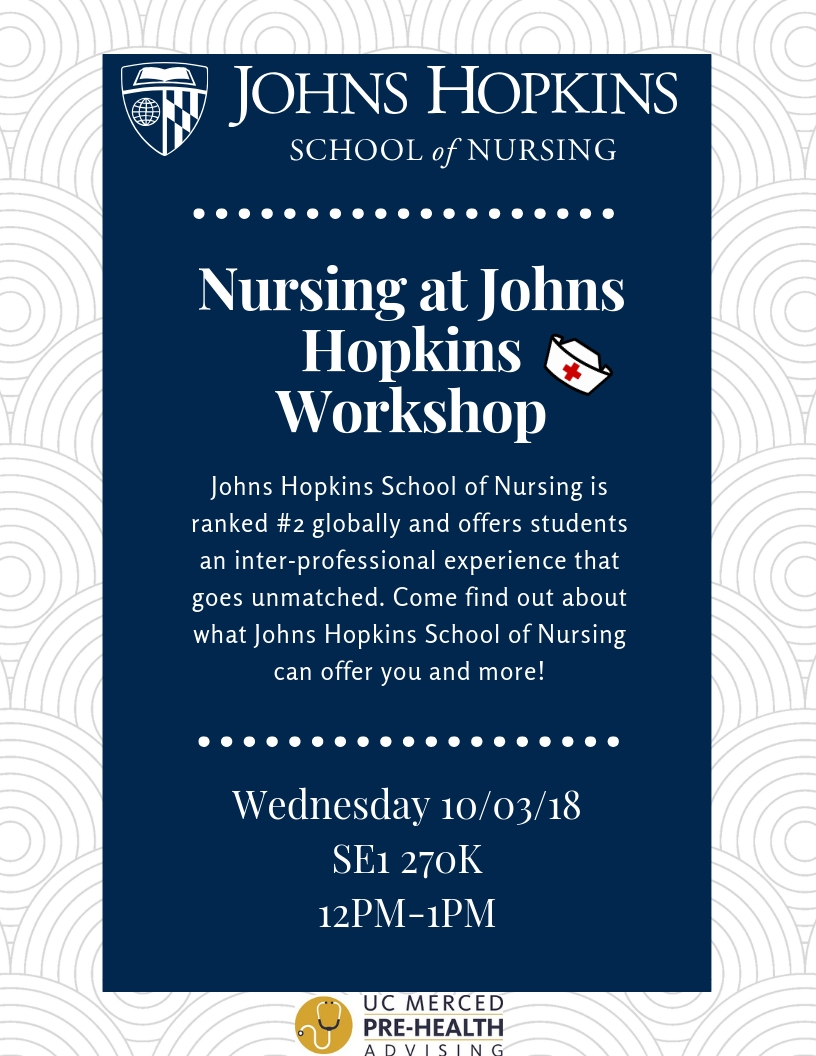 Are you interested in nursing school at one of the top-ranked nursing programs globally? Johns Hopkins School of Nursing will be here to talk about their nursing program on Wednesday October 3rd in SE1 270K from 12PM to 1PM! Be sure to stop by for more information! If you have any questions feel free to email us at prehealth at ucmerced.edu. See you there!