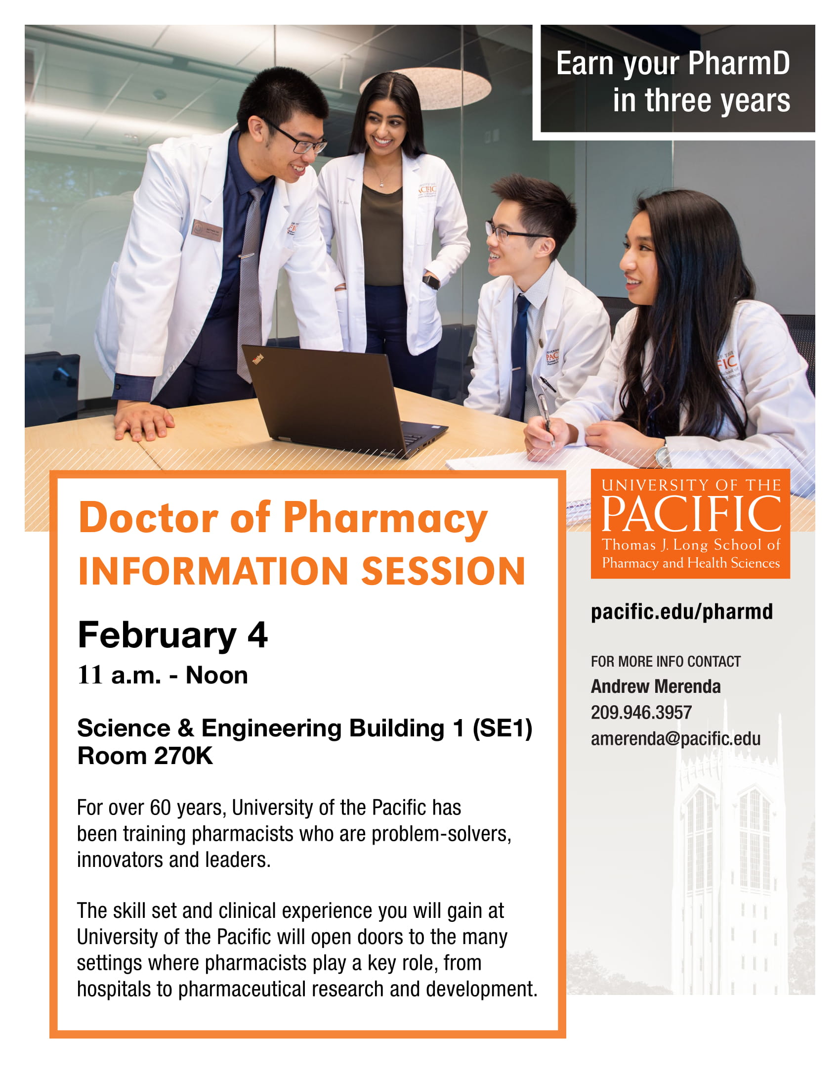 University of the Pacific Thomas J. Long School of Pharmacy will be having a information session taking place on 2/4/19 at 11am-12pm in SE1 270K. This is a great opportunity to learn more about the field of pharmacy.