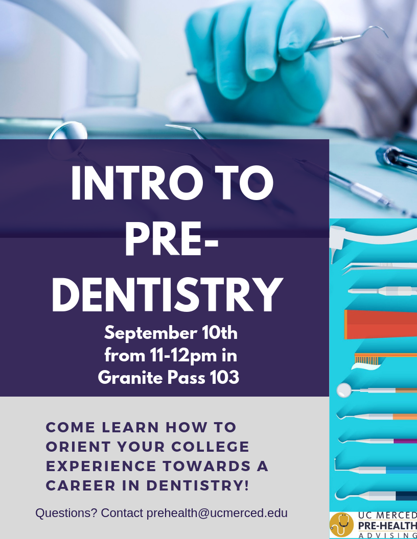 Interested in a career in dentistry but don't know how to get there. Come check out the Intro to Pre-Dentistry workshop where you can learn about what you can do to get admitted to dental school including courses needed, standardized testing and more. This event will take place on September 10th at 11am-12pm in Granite Pass 103. We hope to see you there!