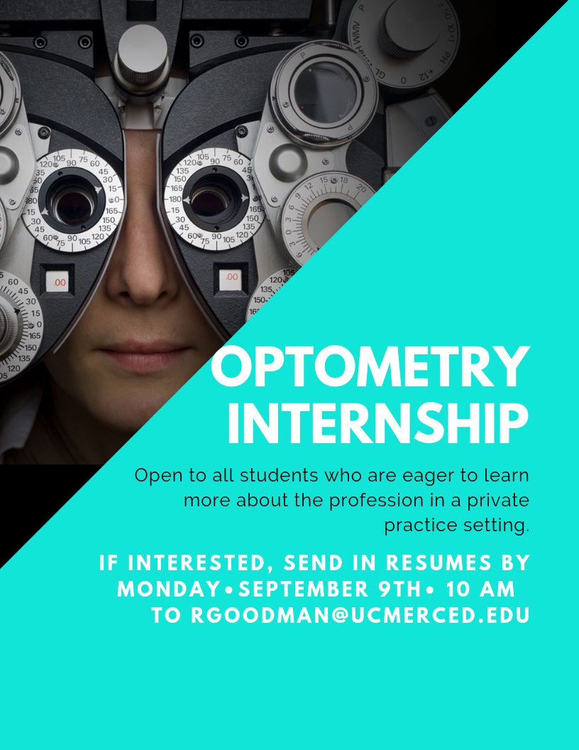Interested in optometry and want to get more experience? Please email your resumes to Robert Goodman where they are searching for motivated candidates interested in the field of optometry. You will have the opportunity to shadow an optometrist in a private practice setting. Please email your resumes to rgoodman at ucmerced.edu by this upcoming Monday(9/9) by 10AM.