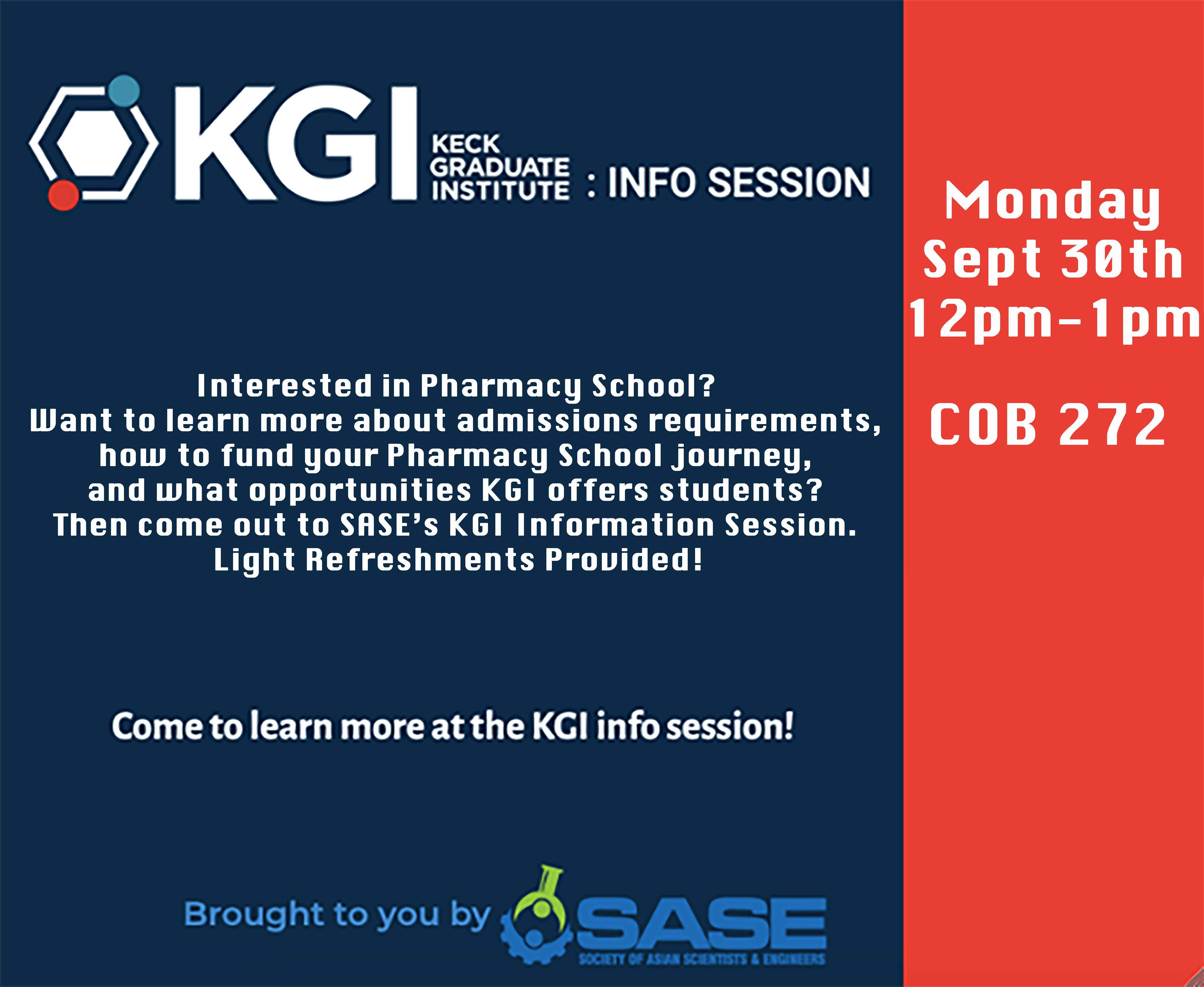 Come learn from someone who works in the Admissions office, how people pay for Pharmacy School, and what opportunities KGI has to offer! The event is September 30, from 12-1 pm in COB 272.