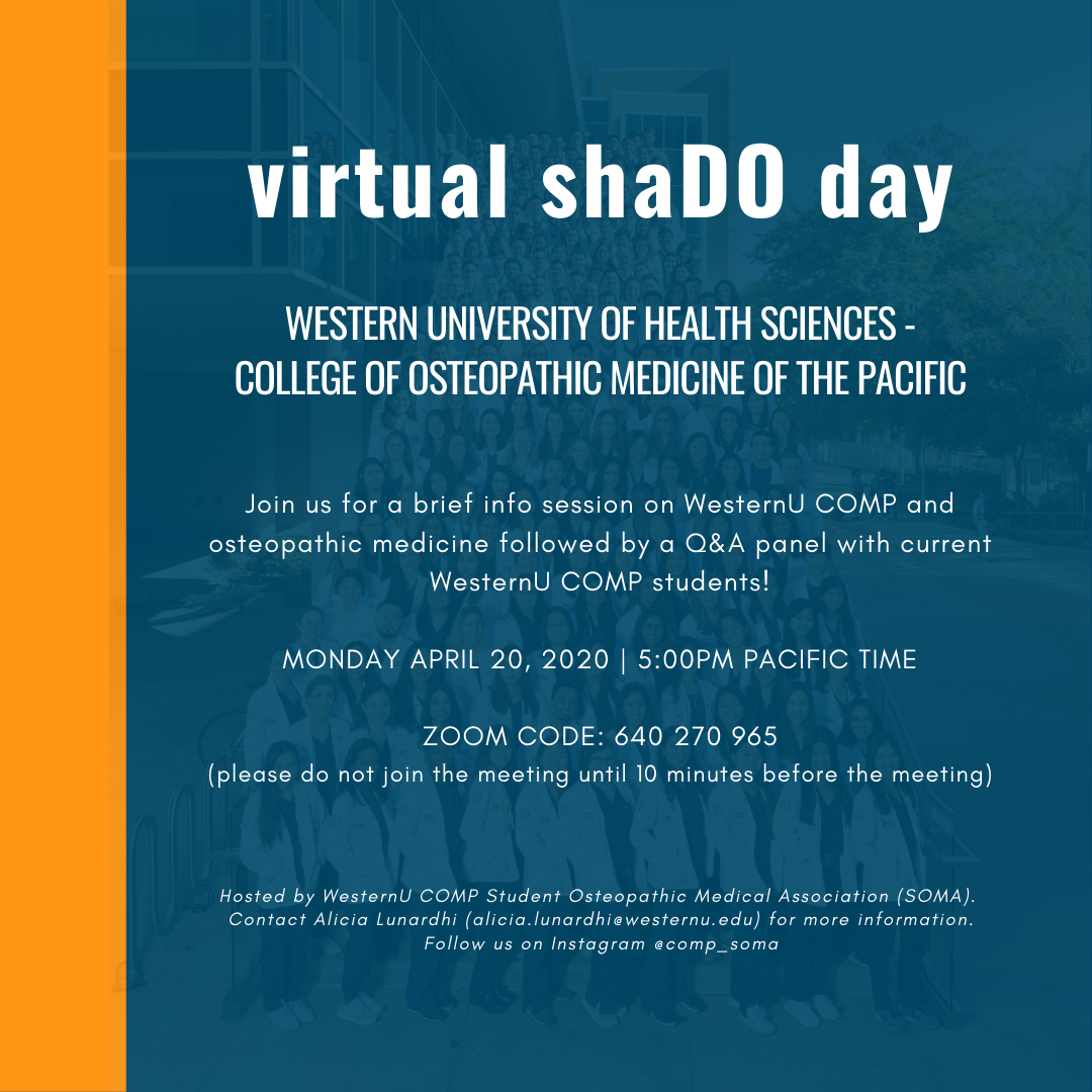 Western University of Health Sciences College of Osteopathic Medicine of the Pacific Student Osteopathic Medical Association (WesternU COMP SOMA) is hosting a virtual ShaDO Day on Monday April 20, 2020. ShaDO Day is normally in person and an opportunity for pre-medical students to shadow our DO students and get a glimpse of what a day in the life of a medical student is like. Unfortunately, in light of the COVID-19 situation and in accordance with public health recommendations, ShaDO day 2020 is cancelled. However, in its place, we would like to host a virtual Q&A session.