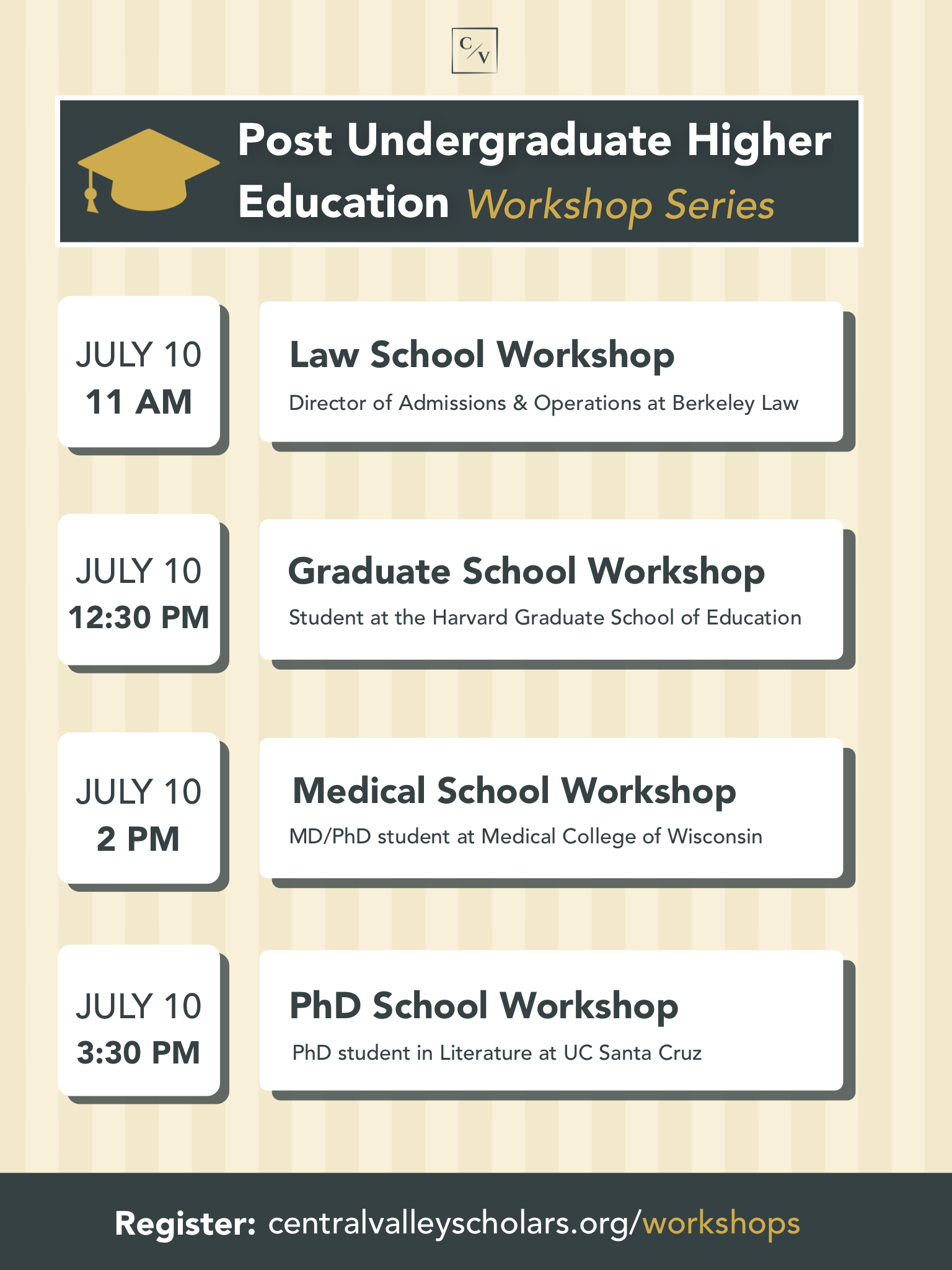 Please visit Central Valley Scholar’s Workshop page here<https://www.centralvalleyscholars.org/workshops> and clicking on the workshop you are interested in, where you will be directed to its Eventbrite page to register and read more about the webinars.