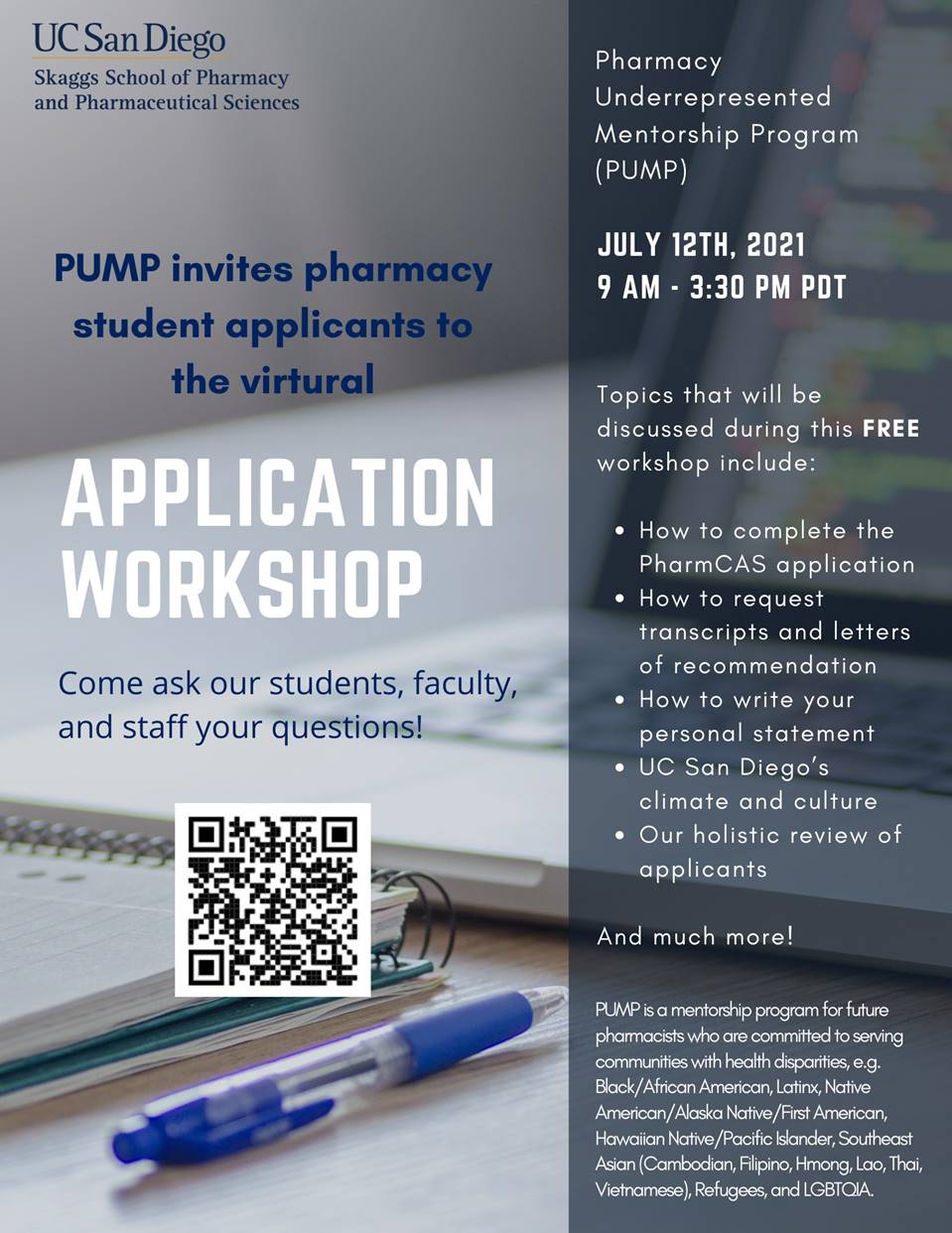 We'd like to invite any of your interested students who are applying to pharmacy school this year (for Fall 2022 admissions) to participate in our Pharmacy Underrepresented Mentorship Program (PUMP) PharmCAS Application Workshop. Please see the attachment or the image below for details on this workshop. You can scan the QR code or click on the image below to register, absolutely FREE.