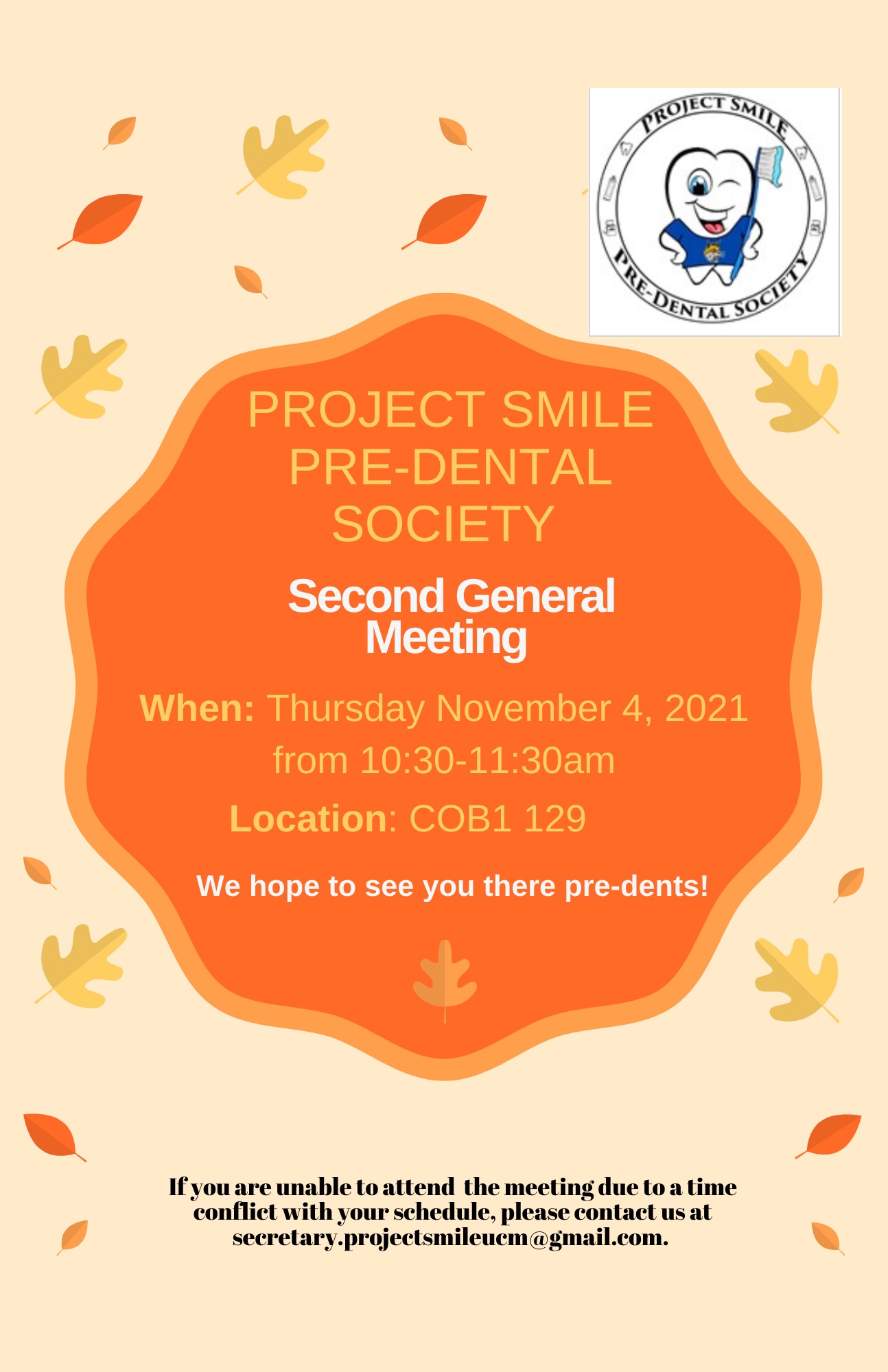 Project Smile is a group of diverse individuals that share a common goal of becoming dentists. We promote oral health awareness through volunteer work, outreach, and by attending various workshops. We’re having our second general meeting this Thursday, November 4th at COB 129. We hope to see pre-dentals there!