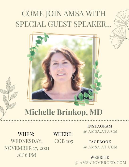 The American Medical Student Association (AMSA) at UC Merced invites you to join us with our guest speaker this week, Wednesday (11/17/21) at 6 PM in COB 105. Dr. Brinkop is the current medical advisor for AMSA at UC Merced, and she will be speaking about her pathway to medicine, her current experience in medicine and much more.