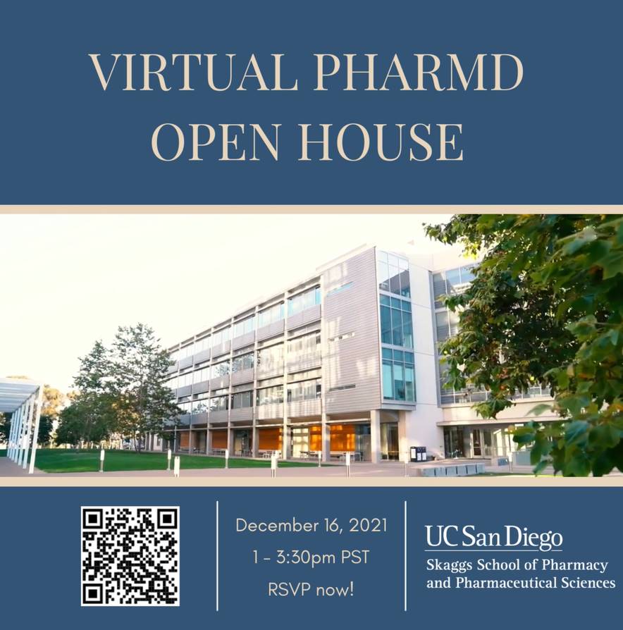We'd like to officially invite you to the UC San Diego Skaggs School of Pharmacy and Pharmaceutical Sciences Virtual PharmD Open House. Please see the attached flyer (also shown below) for details and registration information.