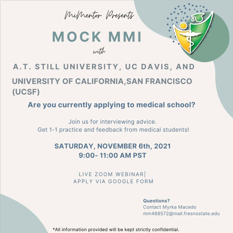 MiMentor's Central CA Board is hosting a Mock MMI on Nov 6th for students currently applying to medical school. This event will be hosted with medical students from AT Still, UC Davis, and UCSF. We are giving priority to premedical students from the Central Valley. Please share this opportunity with your network.