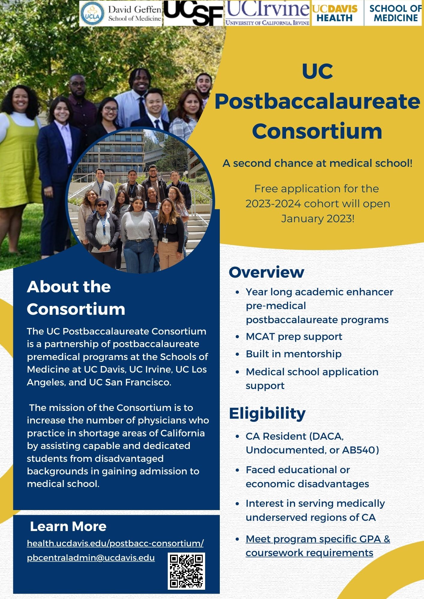 The UC Postbaccalaureate Consortium<https://health.ucdavis.edu/postbacc-consortium/> is a partnership of postbaccalaureate premedical programs at the Schools of Medicine at UC Davis, UC Irvine, UC Los Angeles, and UC San Francisco. The mission of the Consortium is to increase the number of physicians who practice in shortage areas of California by assisting capable and dedicated students from disadvantaged backgrounds in gaining admission to medical school.