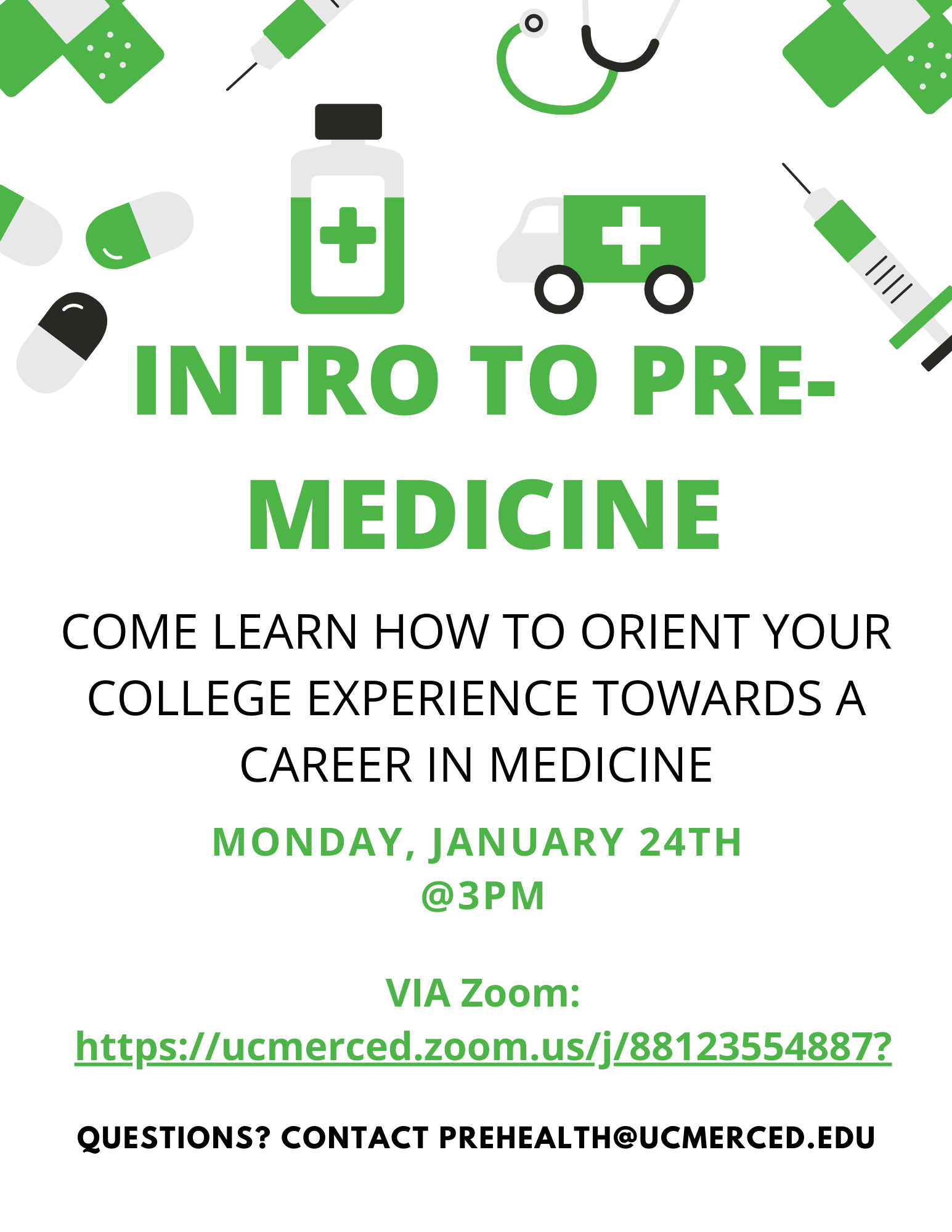 Are you considering a career in Medicine? UC Merced NS Pre-Health Advising will be hosting a virtual Introduction to Pre-Medicine presentation on Monday, January 24, 2022 3-4pm. I have attached the flyer for more details. We hope you can join us!