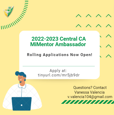 My name is Vanessa Valencia and I am currently the external president for MiMentor. MiMentor is an organization geared towards providing pre-health students with information/resources on how to navigate pre-health pathways and opportunities for mentorship through various workshops. The Central California region is searching for ambassadors to join our team! If you would like any additional information, please let me know.