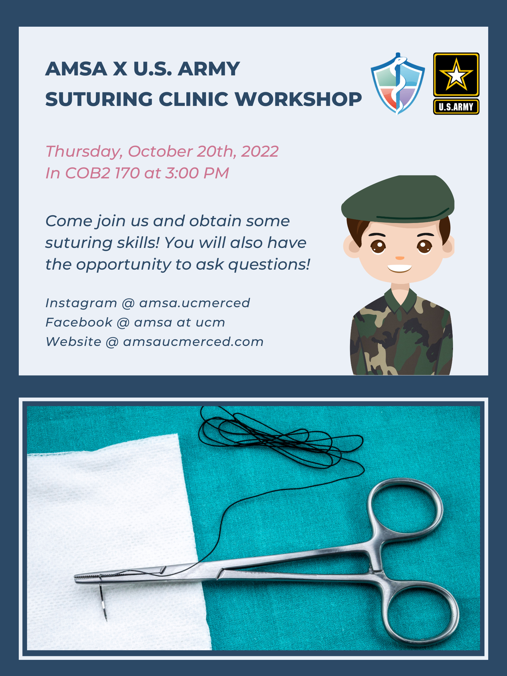 The American Medical Student Association (AMSA) is partnering up with the U.S. Army, where we will be hosting a Suturing Clinic Workshop on Thursday, October 20, 2022 at 3:00 PM in COB2 170.