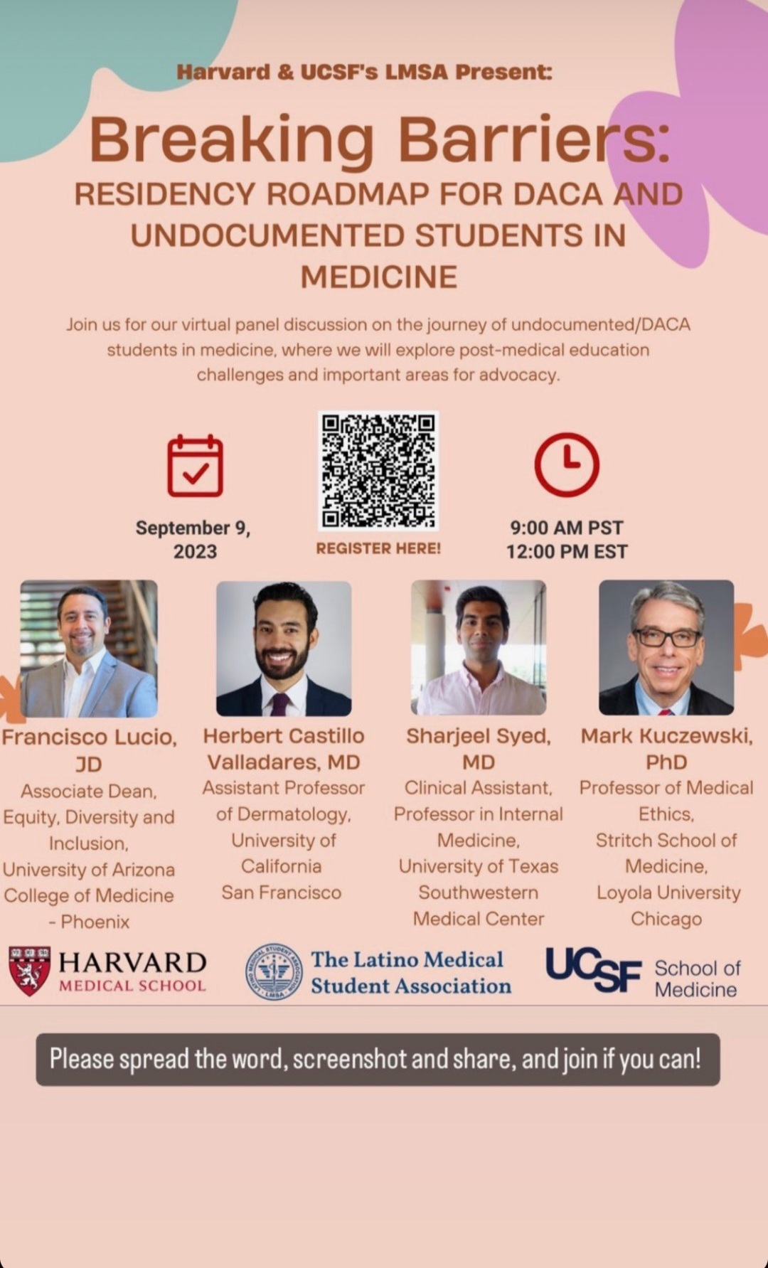 Harvard and UCSF's LMSA will be hosting a Virtual Panel Discussion on the Journey of Undocumented students in medicine on September 9, 2023 9am-12pm. Please see attached flyer for more information. We hope you can join us!