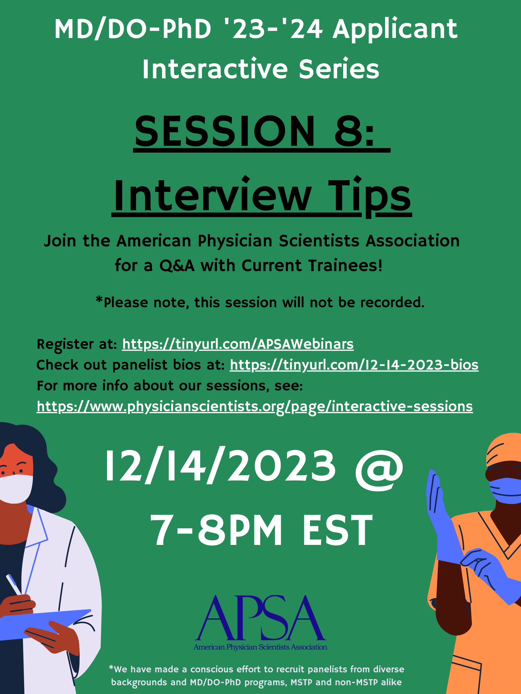 If you are currently applying or planning to apply to MD-PhD or DO-PhD programs, the American Physician Scientists Association is supporting you with an interactive session occurring on Thursday, Dec 14, at 7PM Eastern Time. This event is geared towards students who are considering a path as a physician-scientist and have questions about interviewing at MD/DO-PhD programs. A panel of current trainees will be available to answer your questions live. Anyone can join; you do not have to be applying this cycle to participate!