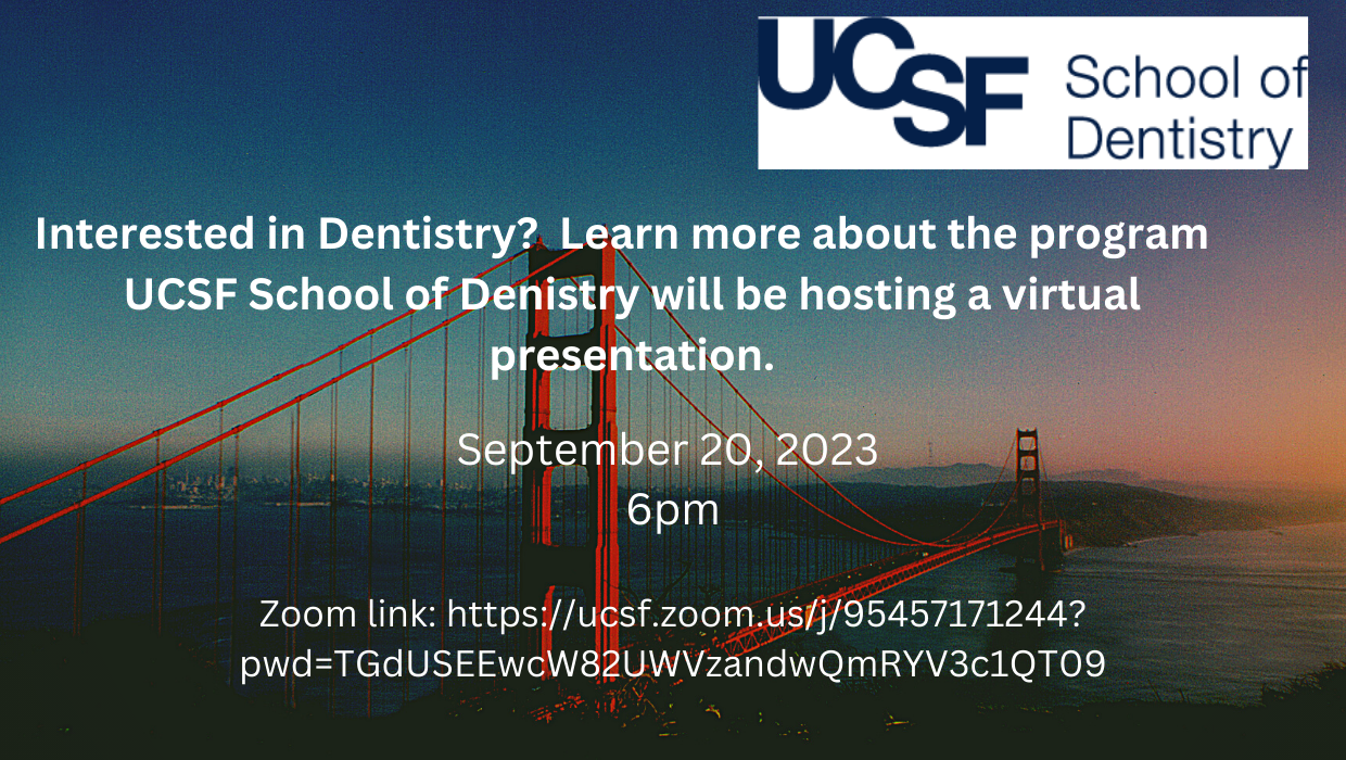 Today, UCSF School of Dentistry will be hosting a virtual presentation at 6:00pm. I will add the zoom link below if you would like to join the presentation.