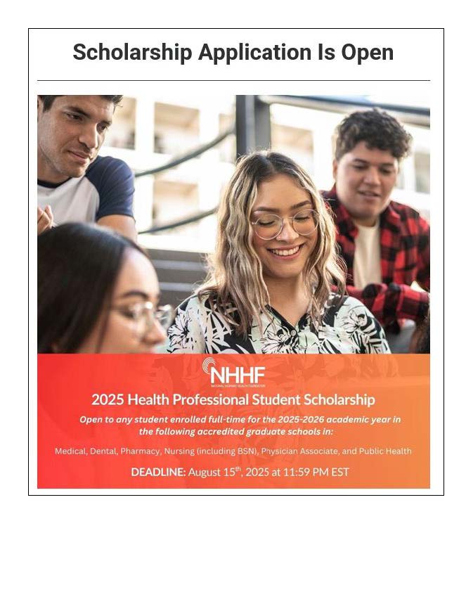 The NHHF Health Professionals Scholarship<https://nationalhispanichealthfoundation.org/health-professional-student-scholarship/> is now open to all full-time students enrolled for the 2025-2026 academic year!