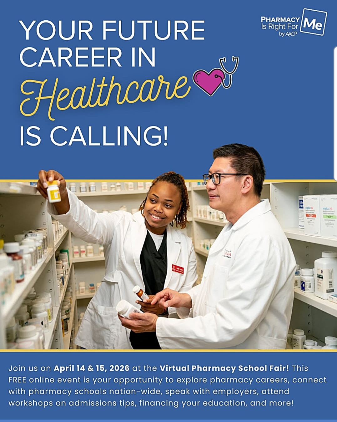 Registration is now open for the 2026 Spring Virtual Pharmacy School Fair<https://pharmacyforme.org/event/aacp-spring-virtual-pharmacy-school-fair> on April 14, 2026. This FREE online event gives students the chance to connect directly with pharmacy schools nationwide, attend workshops, and learn about diverse career paths in pharmacy.