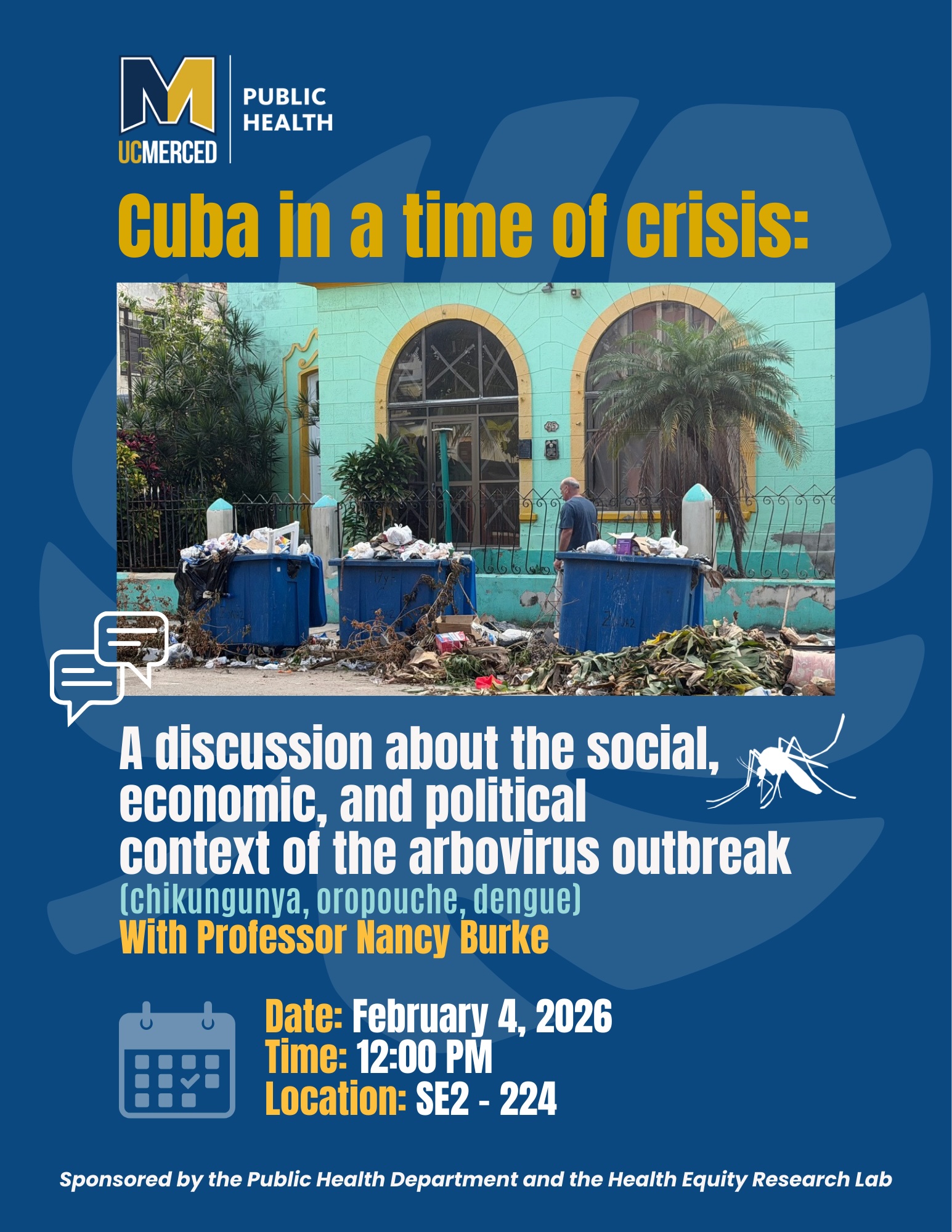 We wanted to inform you all about a great learning opportunity. Dr. Nancy Burke, Professor of Public Health, will be giving a talk about her recent trip to Cuba and the arbovirus outbreak there. It will be today at 12noon in SE2-224. Please see attached flyer for more information.