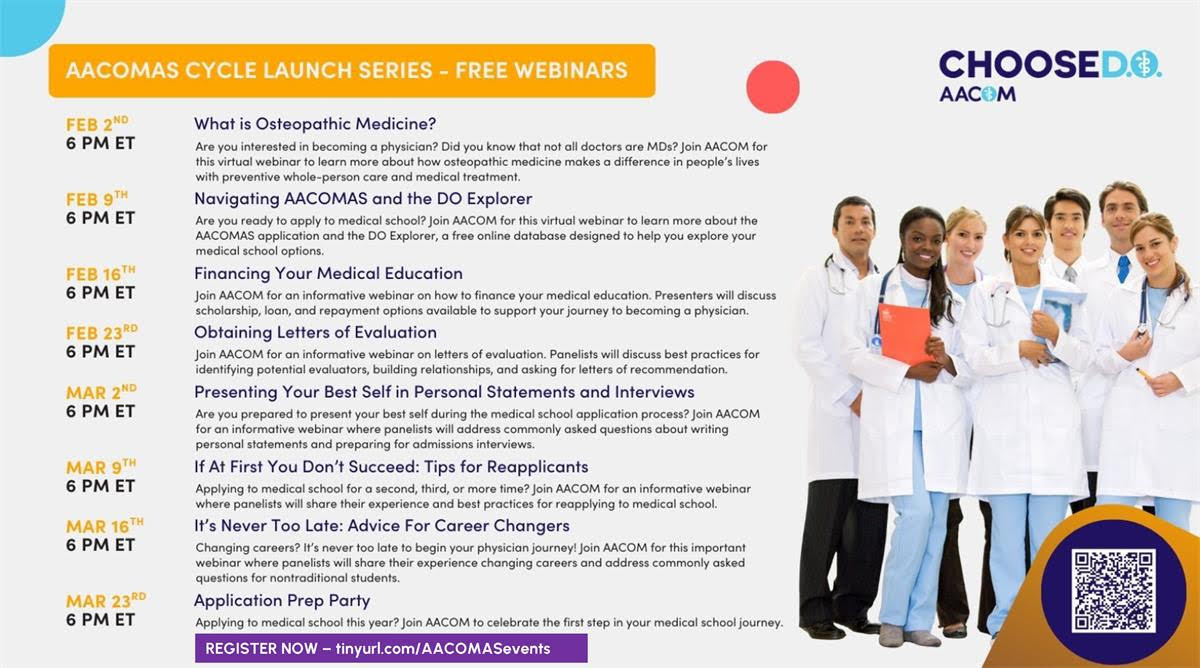 Free AACOMAS Webinar Series for Pre-Med Students<https://www.aacom.org/become-a-doctor/prepare-for-medical-school/com-recruiting-events>