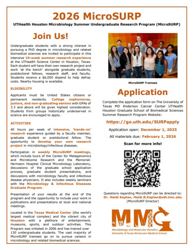 * MicroSURP<https://med.uth.edu/oep/summer-research-program__trashed/microsurp/> - The microSURP<https://med.uth.edu/oep/summer-research-program__trashed/microsurp/> program is directed at students with a strong interest in obtaining a Ph.D. who are interested in microbiology research. This 10-week program (May 26 thru July 31) includes a $6000 stipend and convenient housing for participating students is available. Read More>><https://med.uth.edu/oep/microsurp/>
