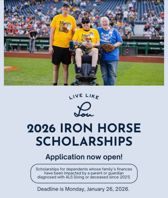 If you or someone you know has been touched by Lou Gehrig's disease (ALS) and is a dependent whose family's finances have been impacted due to a parent or guardian (living or who passed in 2021 or after) having been diagnosed with ALS, please invite them to submit an interest application<https://my.reviewr.com/s2/site/IHS26> for an Iron Horse Scholarship. This renewable, four-year scholarship provides up to $2,130 per semester for up to eight semesters for students pursuing a degree.