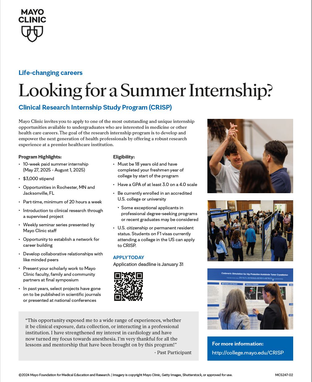 2026 Clinical Research Internship Study Program at Mayo<https://college.mayo.edu/academics/non-clinical-education/clinical-research-internship-study-program-florida/>