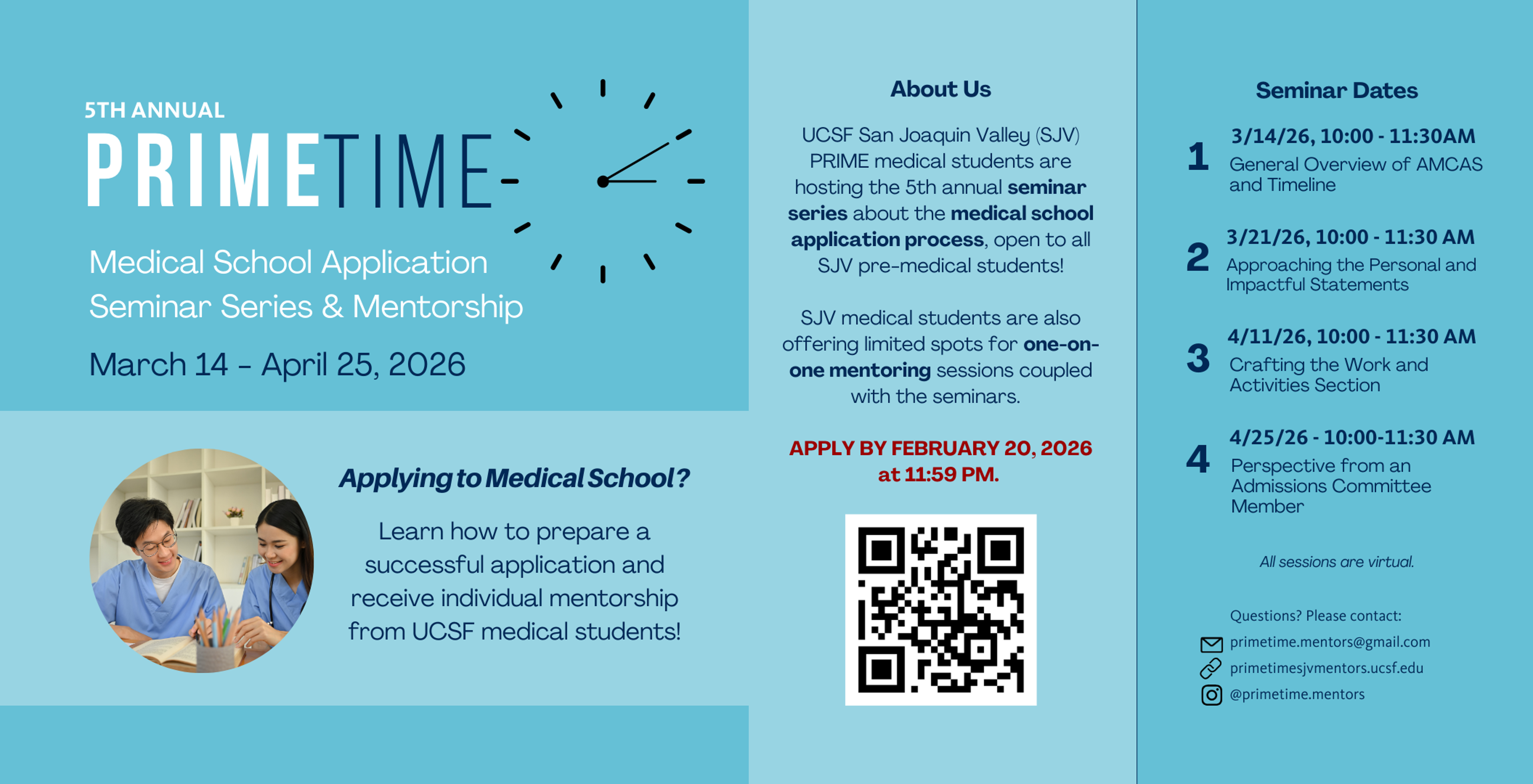 PRIME Time is a 4-session online series regarding the medical school application process. Our goal is to provide guidance and mentorship to pre-medical students of the under-resourced and under-served Central Valley.