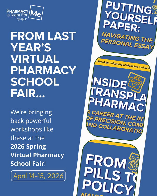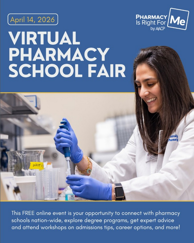 Registration is now open for the 2026 Spring Virtual Pharmacy School Fair<https://pharmacyforme.org/event/aacp-spring-virtual-pharmacy-school-fair> on April 14, 2026. This FREE online event gives students the chance to connect directly with pharmacy schools nationwide, attend workshops, and learn about diverse career paths in pharmacy.